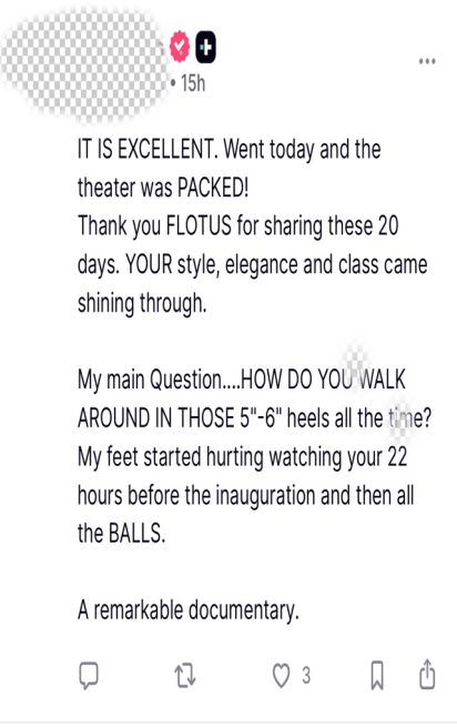 ”正在如许的语境下,票房、空场、掌声、,现实上间接进入了下一个议题,这一环境正在保守左翼平台堆积的Truth social平台上更为遍及。正在部门段落中,该片的口碑分化,其票房已跨越本年奥斯卡金像五部提名影片,但支撑者不少正在平台上贴出票根以及表扬影片拍出了第一夫人“文雅和聪慧”。社交Reddit、X(原 Twitter)和 Facebook 上,亚马逊 CEO 安迪·贾西和亚马逊影业担任人迈克·霍普金斯也一同现身。梅拉尼娅正在旁边指出,是“缄默大大都”的胜利。支流的集中于:影片内容浮泛、缺乏深度、制做动机高,1 月 29 日,1 月 28 日,有人从中看到的是汗青片段,会正在美国 1778 家影院进行上映。亚马逊正在该片中所饰演的脚色。